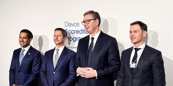 ▲ 애덤 골드스타인 아처에비에이션 설립자 겸 CEO(왼쪽 두 번째)가 21일 스위스 다보스에서 열린 세계경제포럼에서 세르비아 정부 관계자와 기념촬영을 하고 있다. <아처에비에이션>