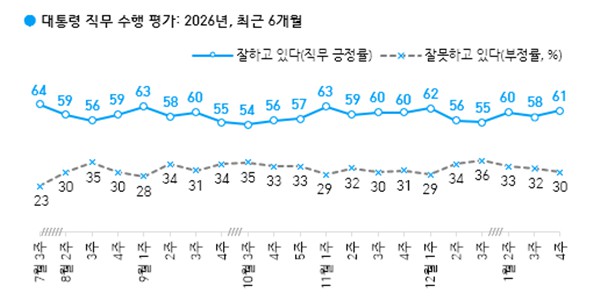한국갤럽이 23일 발표한 이재명 대통령 직무수행 평가에서 ‘잘하고 있다’는 61%, ‘잘못하고 있다’는 30%로 집계됐다. ‘의견 유보’는 10%였다.