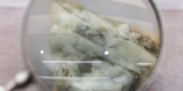 ▲ 중국 베이징 소재 지질박물관이 2025년 10월14일 희토류 광물을 함유한 모나자이트 표본을 확대경 뒤에 전시하고 있다. <연합뉴스>