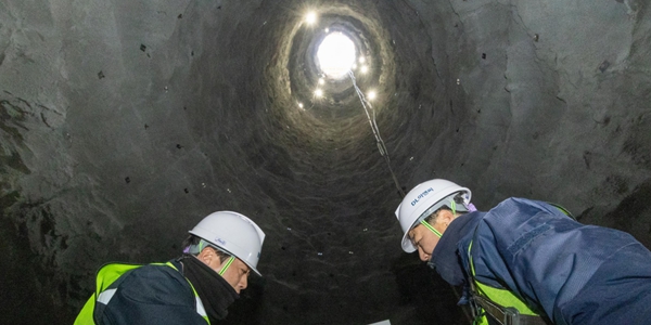 ▲ DL이앤씨 관계자가 부산항 신항 북측 컨테이너부두 2단계 항만 배후단지 공사 현장 수직 터널 내부에서 굴착 작업을 이끌고 있다. < DL이앤씨 >
