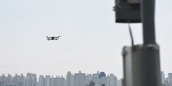 ▲ 삼성전자의 5G 네트워크 성능 최적화 솔루션을 탑재한 드론이 2020년 수원 디지털시티에 설치된 기지국 및 안테나에 근접해 사진을 촬영하고 있다. <삼성전자>