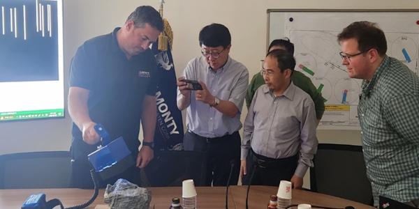▲ 미국 지질조사국(USGS) 산하 국립광물정보센터(NMIC) 조사단이 2024년 8월 알몬티중공업의 강원 영월읍 상동광산에서 적외선 기기로 비춘 텅스텐 정광을 살펴보고 있다. <연합뉴스>