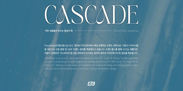 KCC가 제안한 디자인 키워드 ‘카스케이드’는 ‘균형’과 ‘안정감’을 중시하는 최근 소비자 정서를 반영했으며 트렌드 컬러 ‘카스케이드 블루’는 건축자재·산업재·모빌리티 등 다양한 분야에서 활용도가 높을 것으로 기대된다.
