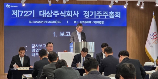 ▲ 임정배 대상 대표이사 사장이 26일 서울 종로구 종로플레이스에서 열린 정기 주주총회에서 발언하고 있다. <대상>