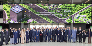 ▲ 나토 주재 30개국 대사단이 지난 14일 경기도 판교 HD현대 글로벌R&D센터를 방문해 기녕촬영하고 있다. < HD현대 >