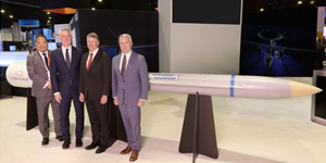 ▲ 한화에어로스페이스는 21일(현지시각) 미국 메릴랜드주에서 열린 'SAS 2026' 전시회에서 노스롭그루먼과 AReS(Advanced Reactive Strike) 미사일 체계의 1단 고체연료 추진체 개발 협력을 위한 협약(MOA)을 체결했다. 왼쪽부터 케빈 슈노버 한화디펜스USA 임원, 마이클 쿨터 한화디펜스USA CEO, 프랭크 몰리 노스롭그루먼 임원, 론 박설 노스롭그루먼 임원이 기념촬영하고 있다. <한화에어로스페이스>