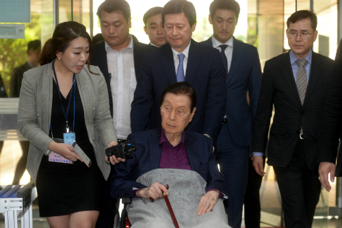 | ▲ 신격호 롯데그룹 명예회장이 지난 7월19일 서울 서초구 서울중앙지방법원에서 열린 '롯데그룹 오너일가 경영 비리 관련 재판에 출석하며 취재진의 질문을 받고 있다. 뒤는 신동주 전 일본 롯데홀딩스 부회장.<뉴시스> | ||