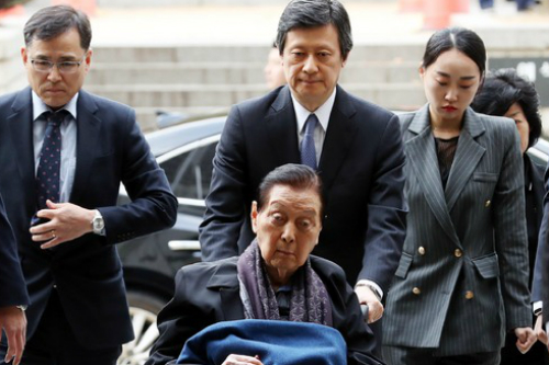 ▲ 롯데그룹 경영비리로 재판에 넘겨진 신격호 롯데그룹 명예회장이 2017년 11월1일 오후 서울 서초구 서울중앙지방법원에서 열린 결심공판에 출석하고 있다. 뒤는 신동주 전 일본 롯데홀딩스 부회장.<뉴시스>