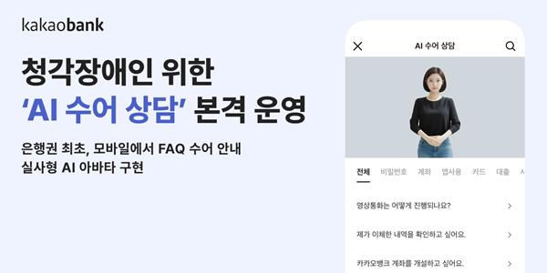 카카오뱅크가 청각장애인 등 금융약자를 위한 금융 접근성 강화에 힘을 싣고 있다.카카오뱅크는 청각장애인 고객이 쉽게 금융 서비스를 이용할 수 있도록 '인공지능(AI) 수어 상담' 서비스 운영을 시작한다고 19일 밝혔다.이번 서비스는 '청각장애인에게 가장 익숙한 언어는 수어'라는 점에 착안해 기획됐다.수어는 일반 국문과 문법 체계가 달라 어려운 금융 용어를 텍스트로 이해하기에 어려움이 있다.카카오뱅크는 모든 내용을 수어 전문가의 교차 검증을 거쳐 정확성과 신뢰도를 확보했다고 설명했다.이 서비스는 이날부터 카카오뱅크 애플리케이션(앱) 안의 '고객센터' 메뉴에서 찾을 수 있다. 전용 기기 없이 스마트폰만으로 시간과 장소에 구애받지 않고 서비스를 이용할 수 있다.카카오뱅크는 청각장애인 등 금융 약자가 앞으로도 다른 사람의 도움 없이 금융 업무를 처리할 수 있는 '자립형 금융 경험' 제공을 목표로 관련 서비스를 강화할 계획을 세웠다.카카오뱅크는 "누구나 금융 정보를 쉽게 이해하고 이용할 수 있도록 하겠다"며 "금융 사각지대를 줄이고 포용 금융을 실천